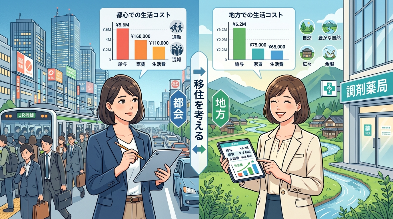 地方転職で薬剤師の暮らしは本当に楽になるのかを、年収・家賃・生活費から比較。30代独身の一人暮らしモデルで、首都圏から地方へ移った場合の手元に残りやすいお金の差を、車代や家賃差も含めてわかりやすくシミュレーションします。
