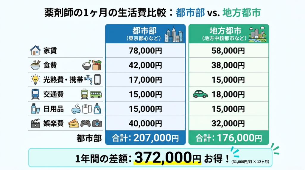 | 年間の生活費差 | 地方のほうが37.2万円低い | |