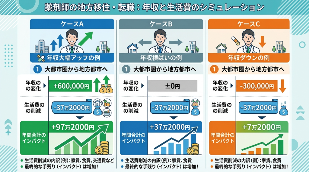 ここでは、30代独身・一人暮らしの薬剤師が、首都圏から地方へ転職する場合を想定して、わかりやすい比較モデルを作ります。なお、下の表は税金・社会保険料を差し引く前のざっくり比較です。厳密な手取りは人によって変わるため、まずは「年収差と生活費差の方向性」をつかむためのシミュレーションとして見てください。
