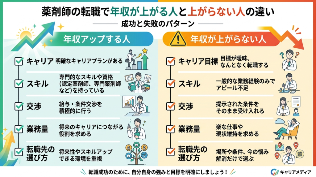 | 比較項目 | 年収が上がる人 | 年収が下がりやすい人 |