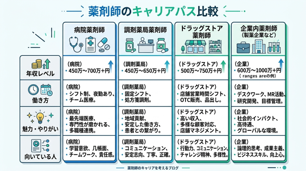 職場別比較表|病院・調剤・ドラッグ・企業の年収と働き方の違い