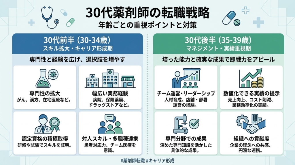 30代は、薬剤師としての基礎スキルに加えて、応需科目の幅、在宅対応、服薬指導、後輩指導などの経験が積み上がる時期です。そのため、20代よりも「できること」が評価されやすく、40代以降よりも柔軟にポジションを変えやすいという強みがあります。