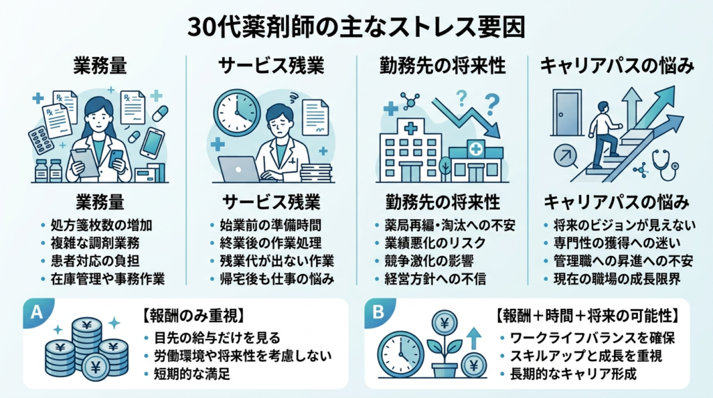 30代薬剤師では「仕事量の多さ」49.3%、「勤務先の将来性・方針」36.0%が主要なストレス要因として示されています。キャリアパスへの不安を感じる層も22.7%存在します。出典:ユーザー提供の抽出データ/Hub内レポート整理