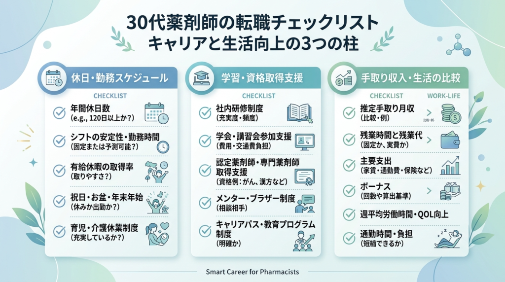 30代薬剤師の転職は、単なる「年収アップ狙い」ではありません。可処分所得・休みやすさ・キャリアの伸びしろまで含めて、10年後の自分を守る投資判断です。