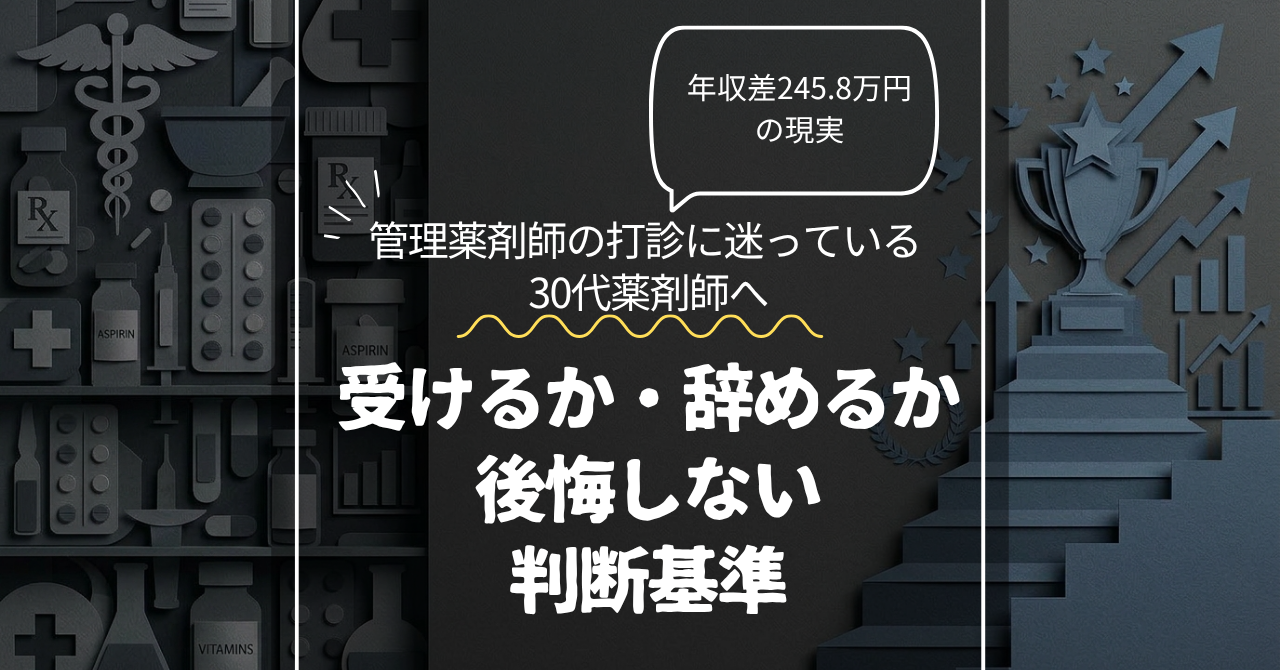 管理薬剤師への昇進は、30代薬剤師にとって生涯賃金を大きく変える可能性がある一方、QOLを左右する重い選択です。大切なのは、年収差だけで飛びつかず、責任・裁量・支援体制まで含めて判断することです。