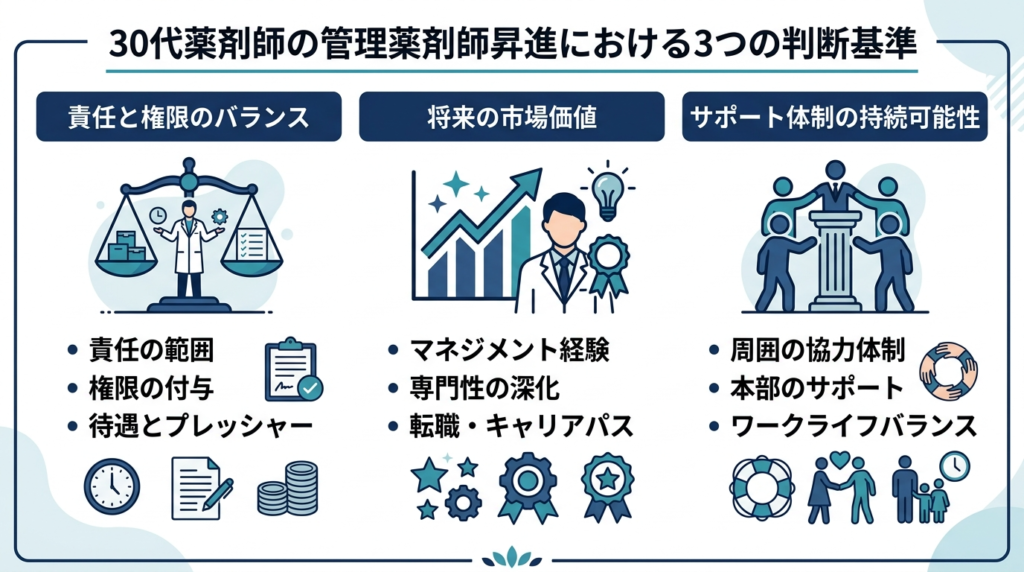 管理薬剤師は、年収726万円という強い経済的魅力がある一方で、30代のストレス要因である仕事量・人間関係・将来不安を一段と背負いやすい役割です。だからこそ、昇進判断では「年収が上がるか」だけでなく、「その職場で責任と支援が見合っているか」を見極める必要があります。