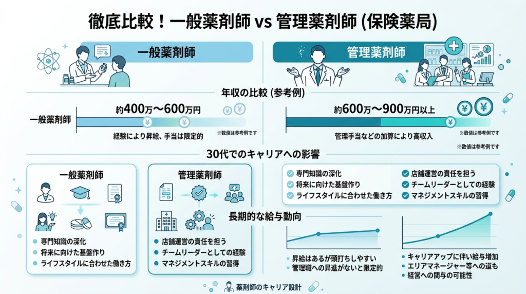 | 比較項目 | 一般薬剤師 | 管理薬剤師 |
