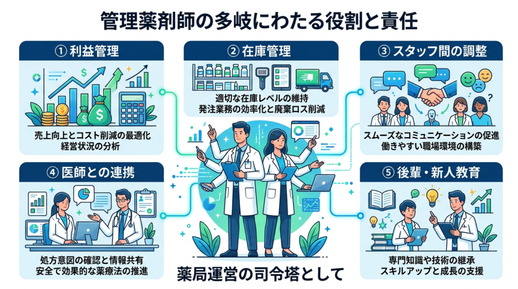 管理薬剤師の負担は、調剤・服薬指導の延長線上に少し仕事が増える程度ではありません。実際には、利益・在庫・人員・対医師関係・若手教育を同時並行で回す役割であり、マルチタスク耐性と対人調整力が強く求められます。